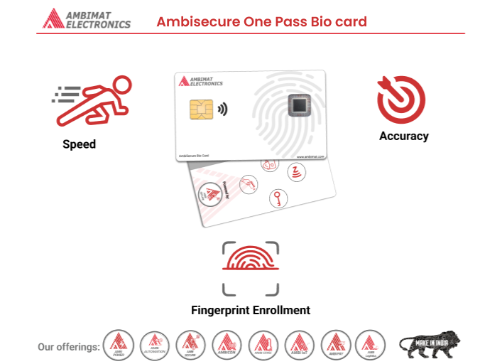 The AmbiSecure FIDO Biometric product works on the AmbiSecure BioCard to use the person’s fingerprint for a password-less future by providing support for the FIDO2 protocol.