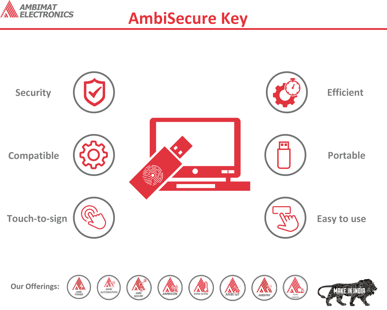 The AmbiSecure Key is a hardware-based authentication solution that is FIDO2 standard compliant. The Key is used to provide a simple and highly secure sign-in feature to any online server supporting FIDO authentication algorithm and enables compliance requirements for strong authentication.